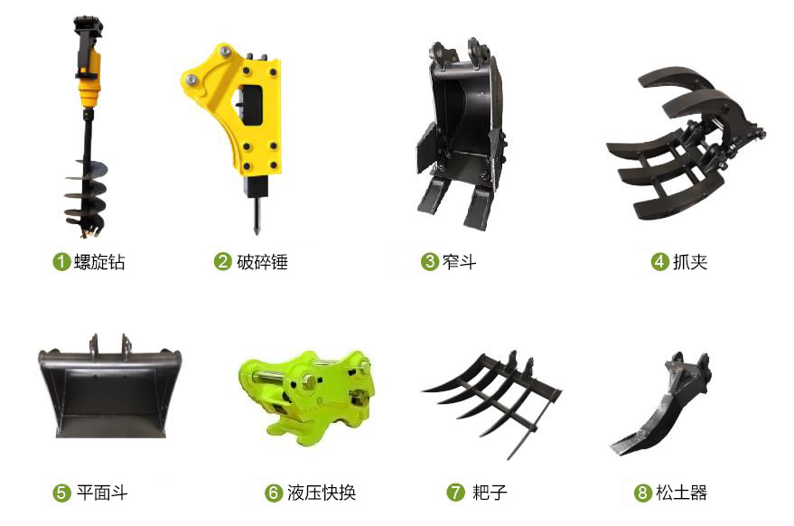 1.8T挖掘機還可以搭配螺旋鉆、抓夾、耙子、松土器、窄斗等屬具使用,滿足不同的施工場合。