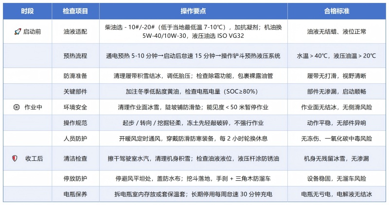 做好設備 “防凍預熱” 是關鍵低溫易導致油液凝滯、電瓶虧電,需優(yōu)先完成三項準備:一是更換適配油液,柴油需選用比當?shù)氐蜏氐?7-10℃的抗凝型號(如 - 10#/-20#),同時添加抗凝劑;液壓油、機油換為冬季低黏度專用款,冷卻液更換為 - 30℃以下防凍型。二是規(guī)范預熱流程,先通電預熱 5-10 分鐘,啟動后怠速運轉 15 分鐘,待水溫超 40℃、液壓油溫超 20℃再操作,露天設備可加裝燃油預熱器提升啟動效率。三是細節(jié)檢查,清理履帶 / 輪胎積雪結冰,調低胎壓增加接地面積,包裹裸露油管,確保暖風、除霜功能正常。