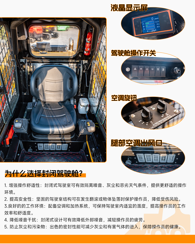 HTS50滑移裝載機(jī)配備快換裝置、安全自鎖裝置、大臂支撐裝置、降噪海綿、前液壓輔助裝置、倒車警報(bào)及喇叭等多重功能配置。