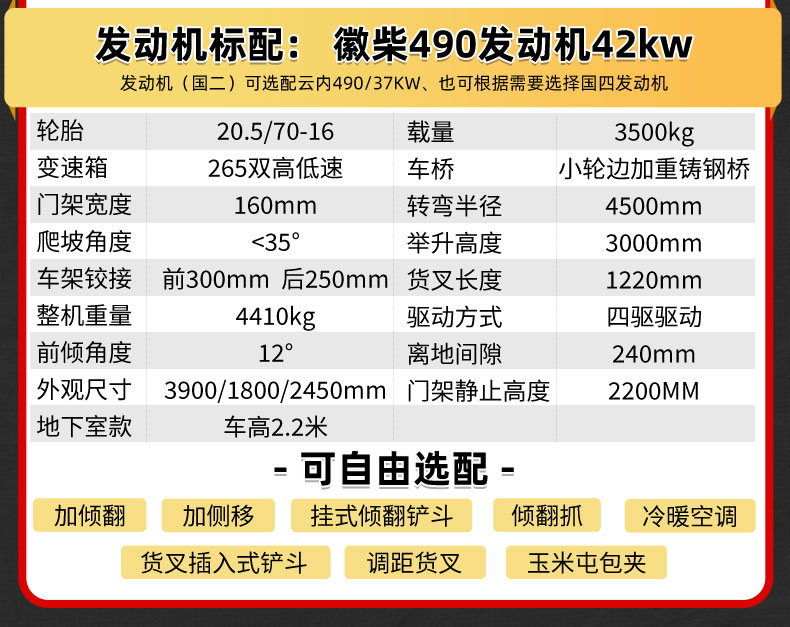發(fā)動(dòng)機(jī)(國二)  標(biāo)配:徽柴490發(fā)動(dòng)機(jī)42kw 選配:云內(nèi)490/37KW